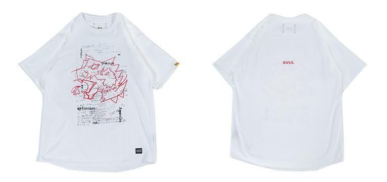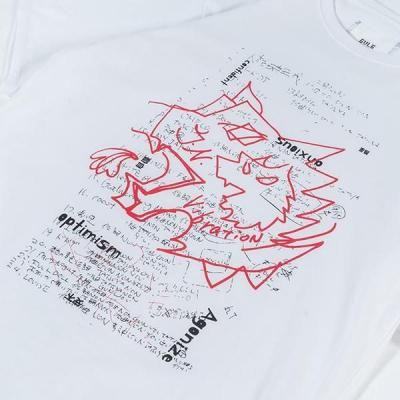 フロント、バック共にシルクスクリーンプリント。 中村達也氏が旅の途中に印続けたノートからデザインや文字を抜粋。そこには苦悩、不安、喜び、欲、自戒などあらゆる混沌とした想いが。そのままにプリントした。サイズ感はオーバーでもタイトでもないジャストサイズで、裾はラウンドしたカットとなっている。