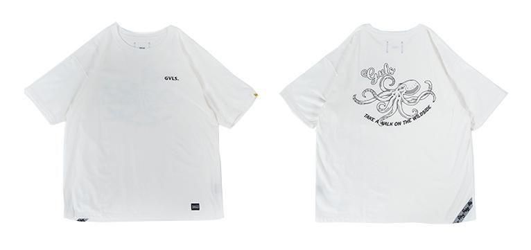 フロント右胸にはワンポイントのGVLSロゴのみのシンプルなデザイン。バックにGVLSのアイコンの1つであるタコを大胆にプリント。